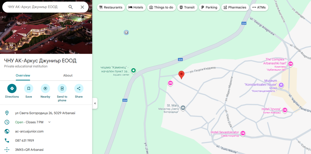 Учебната 2025-2026 за ЧНУ „АК-Аркус Джуниър“ започва в собствена новопостроена сграда. Тя е специално проектирана за начално училище с две подготвителни групи. Намира се в село Арбанаси и се вписва в стила на архитектурния резерват. Освен модерно оборудвани класни стаи, училището разполага с физкултурен салон със стена за скално катерене, спортно игрище, детски площадки, външна класна стая, места за отдих, игра и занимания.